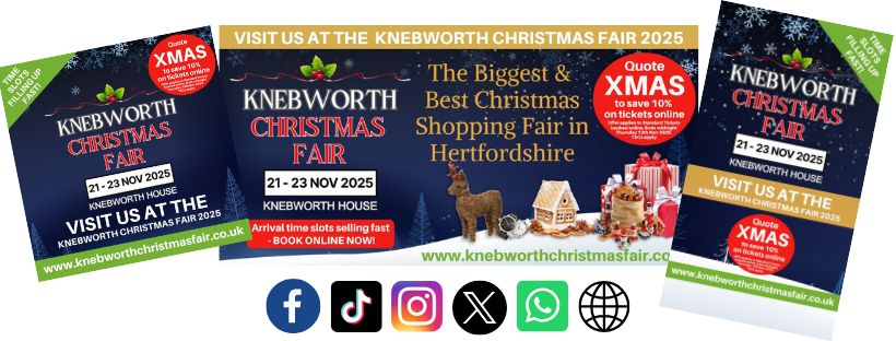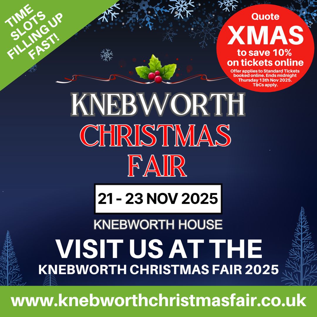 Come and see us at the Knebworth Christmas Fair on Friday 21st, Saturday 22nd and Sunday 23rd November 2025. Tickets are limited but we have a discount code that will save you 10% on entry when you book Standard Tickets online. Just quote XMAS when you book. The offer ends at midnight on Thursday 13th November 2025. To book visit www.knebworthchristmasfair.co.uk.