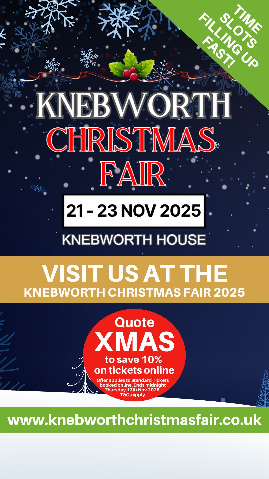As a thank you for promoting your attendance, we’d also like to reward your customers and followers with a discount code that will save them 10% on standard entry tickets. All they need to do is quote XMAS when they book tickets online via our website www.knebworthchristmasfair.co.uk.